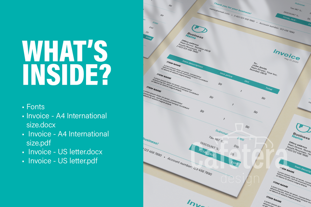 Invoice Template in Microsoft Word (& PDF) in US Letter format and A4 International Size • Set of free fonts (used in this document) • Quick customer support – just drop us a message if you need any help!